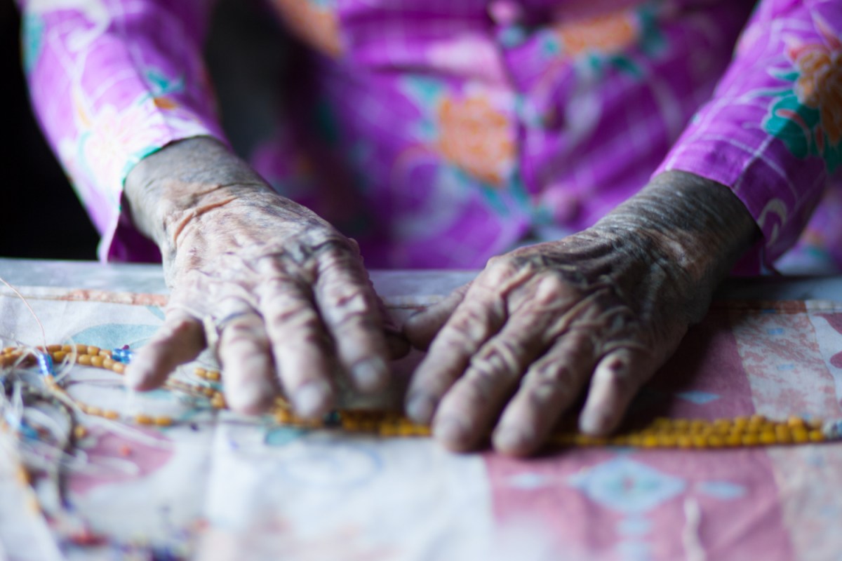 In February 2007, I had the great pleasure of photographing this lovely lady for my book of Malaysian portraits. A Kelabit elder in the highlands of Bario in Sarawak, she goes by several names, as I discovered, the Kelabits have a tradition of having several names. Her full title I believe was Tepuq Na’am Ka’an @ Beken Ayuq @ Sineh Napung Aran @ Dayang Aran. She passed away on 16 April, 2014 at 105 years. She spent her time threading beads to make traditional hats and necklaces. Some of the glass beads are heirlooms and are highly values amongst the Kelabit.