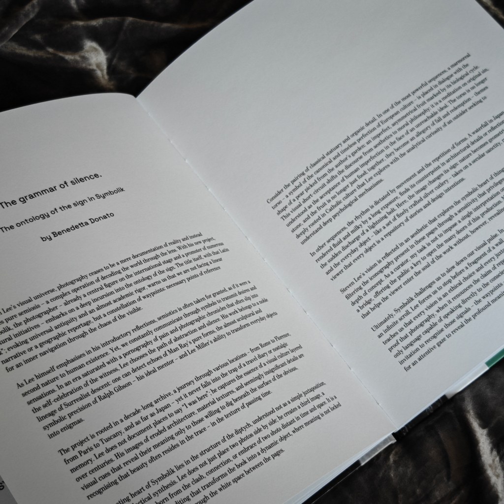 “Ultimately, Symbolik challenges us to slow down our visual pulse. In a world that consumes images at the speed of an infinite scroll, Lee forces us to stop before a fragment of a wall, a reflection on glass, or a body of stone. He teaches us that every vision is an ethical choice and every juxtaposition is an act of semantic creation. This book is proof that photography, when it renounces the claim of reportage to embrace the path of the symbol, becomes the only language capable of speaking directly to the conscience, transcending every geographical barrier. It is an invitation to recognise those signals – the waypoints – that, while remaining before our eyes every day, wait only for an attentive gaze to reveal the profound meaning of our shared human journey.”